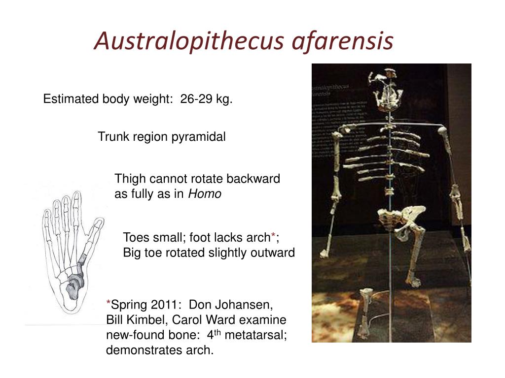 Australopithecus afarensis Estimated body weight: 26-29 kg. Trunk region pyramidal Thigh cannot rotate backward as fully as in Homo Toes small; foot lacks arch*; Big toe rotated slightly outward *Spring 2011: Don Johansen, Bill Kimbel, Carol Ward examine new-found bone: 4th metatarsal; demonstrates arch.