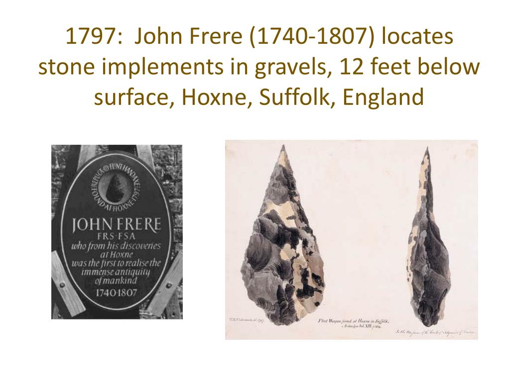 1797: John Frere (1740-1807) locates stone implements in gravels, 12 feet below surface, Hoxne, Suffolk, England
