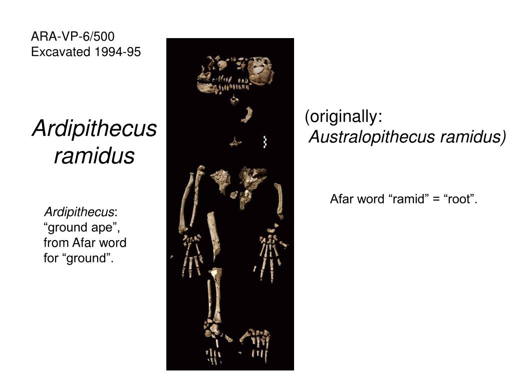 ARA-VP-6/500 Excavated 1994-95 (originally: Australopithecus ramidus) Ardipithecus ramidus Afar word “ramid” = “root”. Ardipithecus: “ground ape”, from Afar word for “ground”.