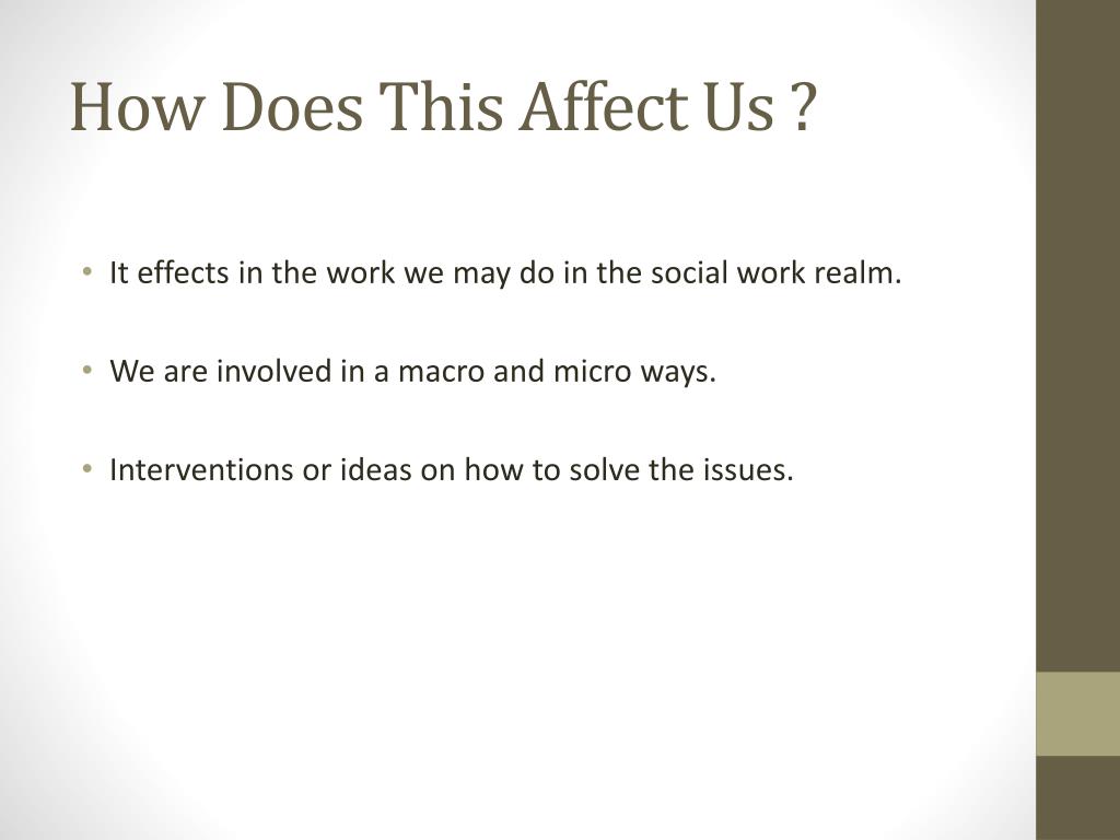 How Does This Affect Us ? • It effects in the work we may do in the social work realm. • We are involved in a macro and micro ways. • Interventions or ideas on how to solve the issues.