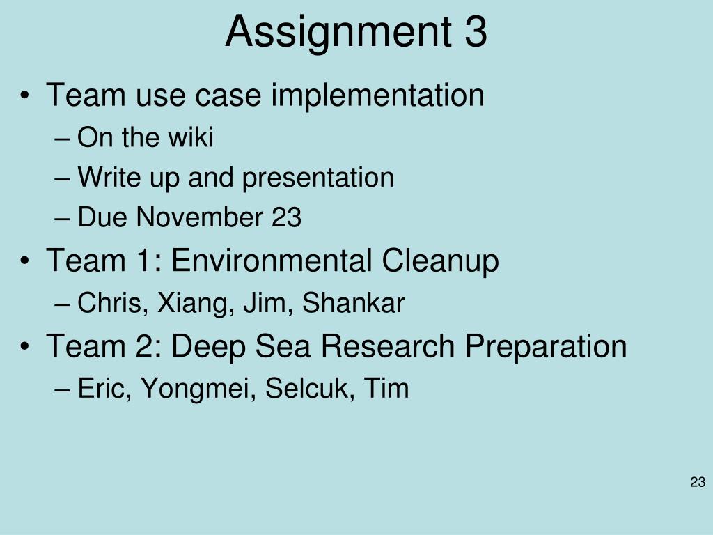 Assignment 3 • Team use case implementation • On the wiki • Write up and presentation • Due November 23 • Team 1: Environmental Cleanup • Chris, Xiang, Jim, Shankar • Team 2: Deep Sea Research Preparation • Eric, Yongmei, Selcuk, Tim