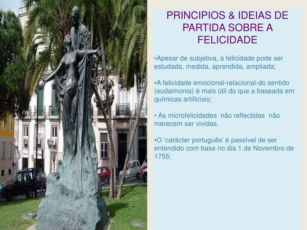 PRINCIPIOS & IDEIAS DE PARTIDA SOBRE A FELICIDADE • Apesar de subjetiva, a felicidade pode ser estudada, medida, aprendida, ampliada; • A felicidade emocional-relacional-do sentido (eudaimonia) é mais útil do que a baseada em químicas artificiais; • As microfelicidades não reflectidas não merecem ser vividas. • O ‘carácter português’ é passível de ser entendido com base no dia 1 de Novembro de 1755;