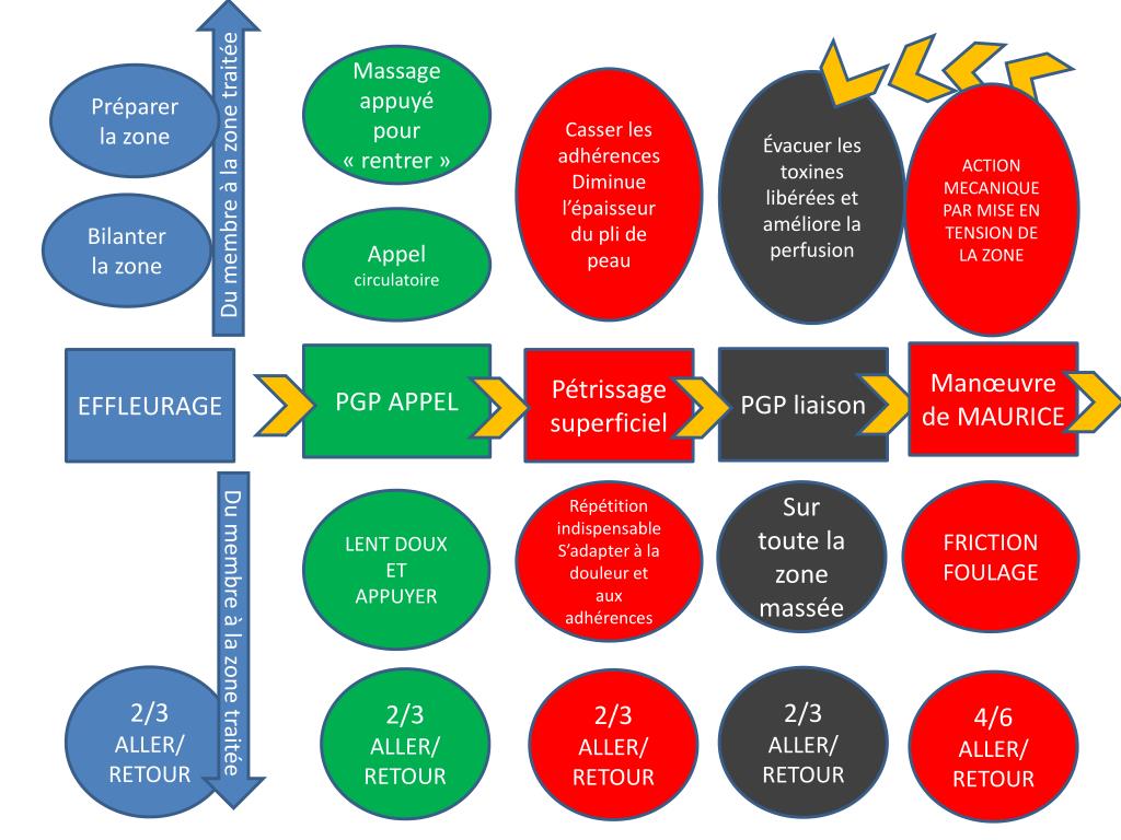 Du membre à la zone traitée Préparer la zone Casser les adhérences Diminue l’épaisseurdu pli de peau Qualité mécanique Évacuer les toxines libérées et améliore la perfusion EN + PGP liaison Calmer la douleur, la chaleur Bilanter la zone Appel circulatoire PGP chasse PGP APPEL PGP liaison EFFLEURAGE Pétrissage superficiel Du membre à la zone traitée Répétition indispensable S’adapter à la douleur et aux adhérences Sur toute la zone massée Attention terminer par un effleurage 2/3 ALLER/ RETOUR 2/3 ALLER/ RETOUR 2/3 ALLER/ RETOUR 2/3 ALLER/ RETOUR 4/6 ALLER/ RETOUR