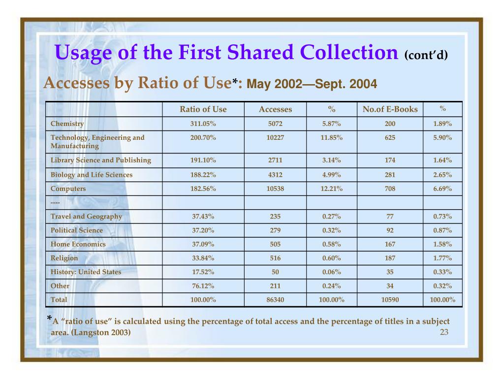 Usage of the First Shared Collection (cont’d) Accesses by Ratio of Use*: May 2002—Sept. 2004 *A “ratio of use” is calculated using the percentage of total access and the percentage of titles in a subject area. (Langston 2003)