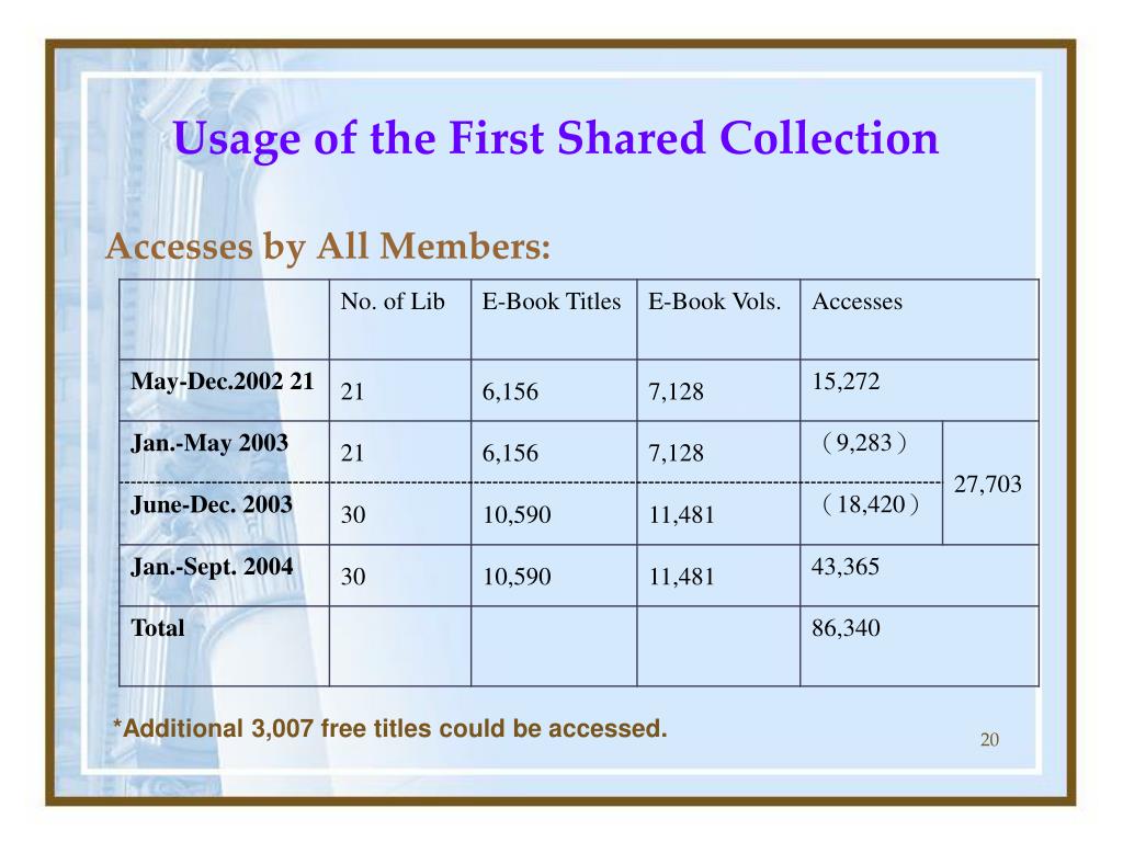 Usage of the First Shared Collection Accesses by All Members: *Additional 3,007 free titles could be accessed.