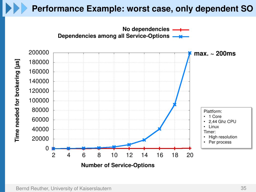 Performance Example: best case, independent SO No dependencies max. ~ 0,6ms Time needed for brokering [µs] • Plattform: • 1 Core • 2,44 Ghz CPU • Linux • Timer: • High resolution • Per process Number of Service-Options