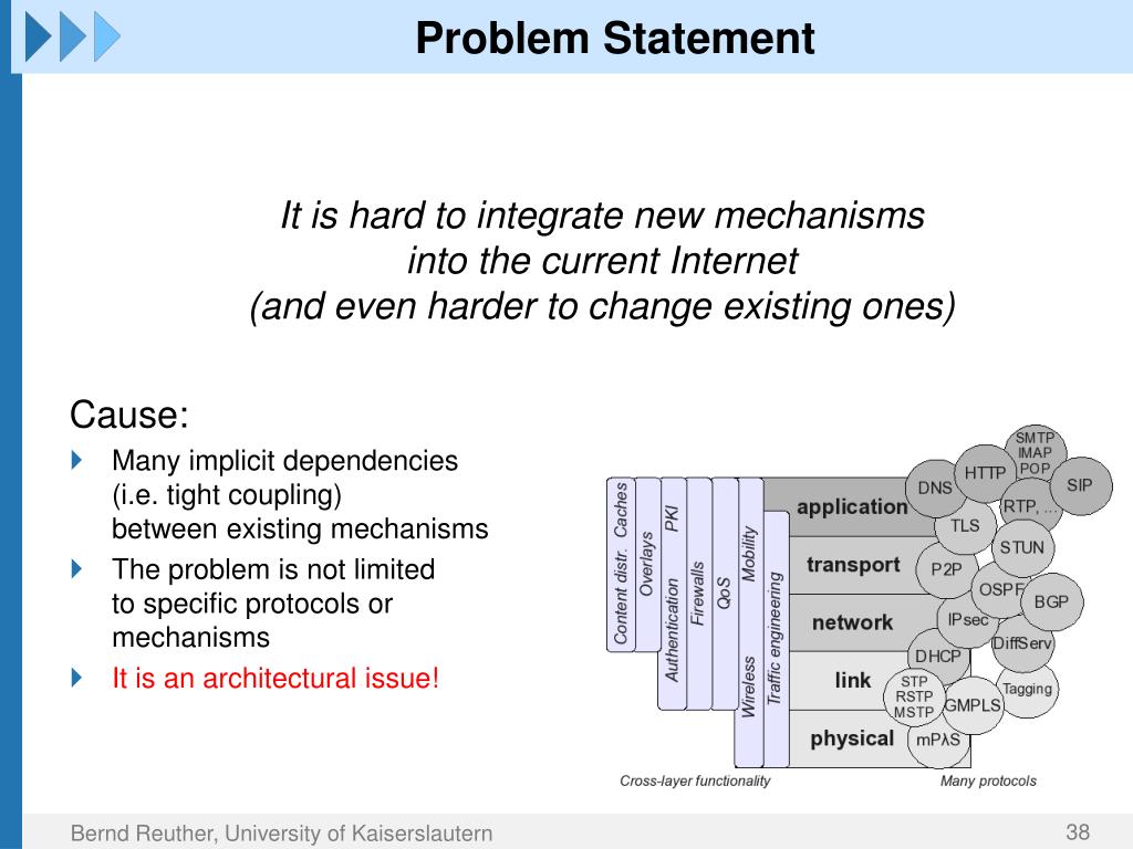Problem Statement It is hard to integrate new mechanismsinto the current Internet(and even harder to change existing ones) Cause: • Many implicit dependencies (i.e. tight coupling)between existing mechanisms • The problem is not limitedto specific protocols ormechanisms • It is an architectural issue!