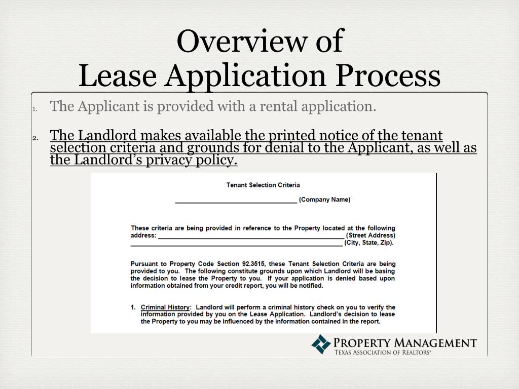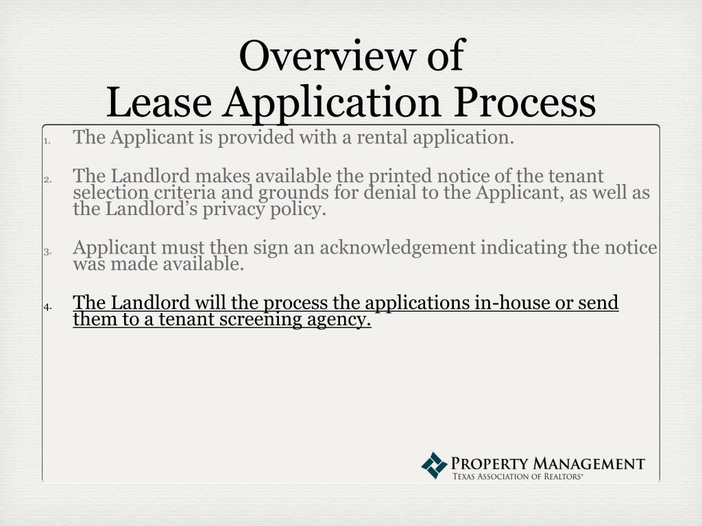Overview of Lease Application Process • The Applicant is provided with a rental application. • The Landlord makes available the printed notice of the tenant selection criteria and grounds for denial to the Applicant, as well as the Landlord’s privacy policy.