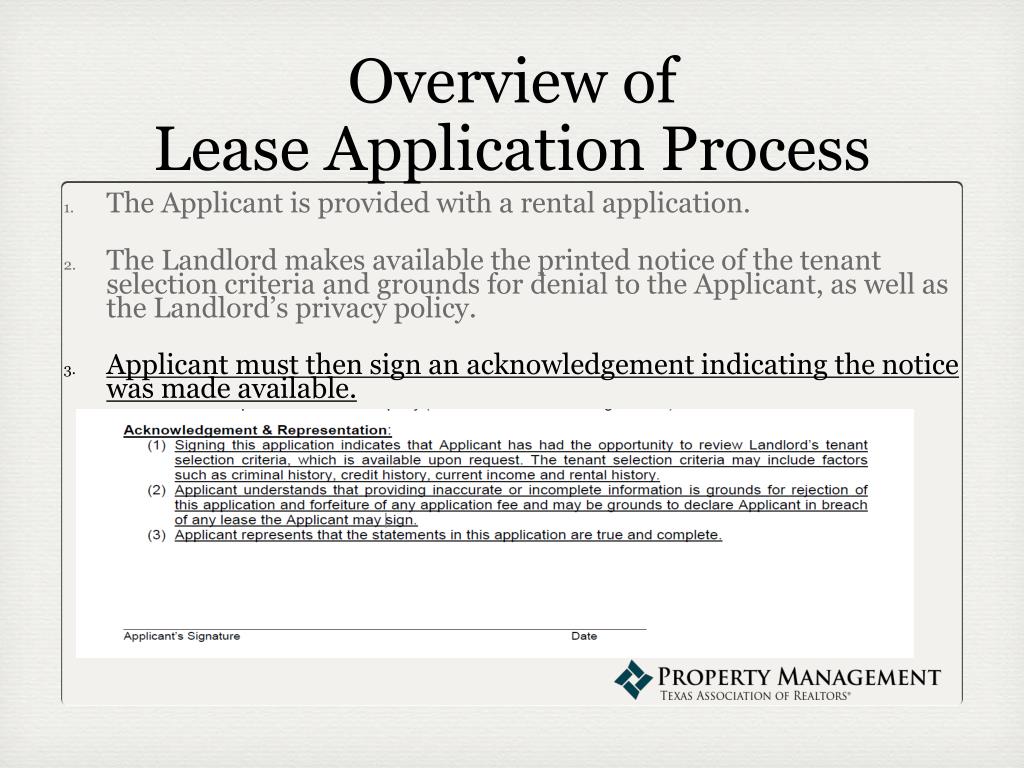 Overview of Lease Application Process • The Applicant is provided with a rental application. • The Landlord makes available the printed notice of the tenant selection criteria and grounds for denial to the Applicant, as well as the Landlord’s privacy policy. • Applicant must then sign an acknowledgement indicating the notice was made available.