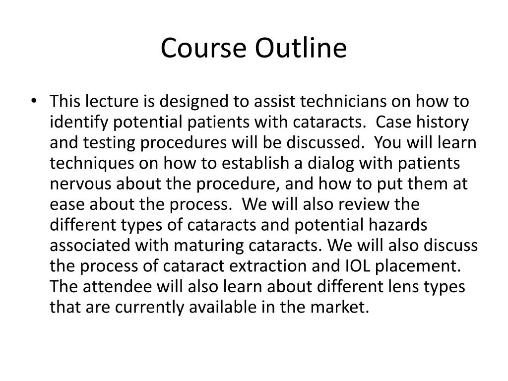 Course Outline • This lecture is designed to assist technicians on how to identify potential patients with cataracts. Case history and testing procedures will be discussed. You will learn techniques on how to establish a dialog with patients nervous about the procedure, and how to put them at ease about the process. We will also review the different types of cataracts and potential hazards associated with maturing cataracts. We will also discuss the process of cataract extraction and IOL placement. The attendee will also learn about different lens types that are currently available in the market.
