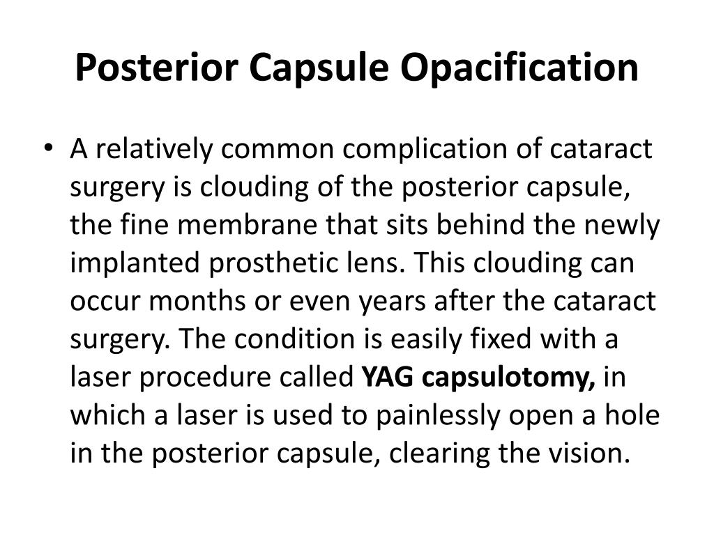 Posterior Capsule Opacification • A relatively common complication of cataract surgery is clouding of the posterior capsule, the fine membrane that sits behind the newly implanted prosthetic lens. This clouding can occur months or even years after the cataract surgery. The condition is easily fixed with a laser procedure called YAG capsulotomy, in which a laser is used to painlessly open a hole in the posterior capsule, clearing the vision.