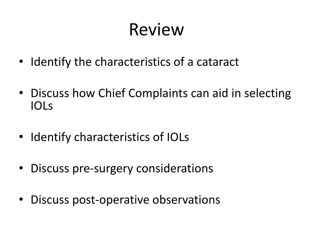 Review • Identify the characteristics of a cataract • Discuss how Chief Complaints can aid in selecting IOLs • Identify characteristics of IOLs • Discuss pre-surgery considerations • Discuss post-operative observations