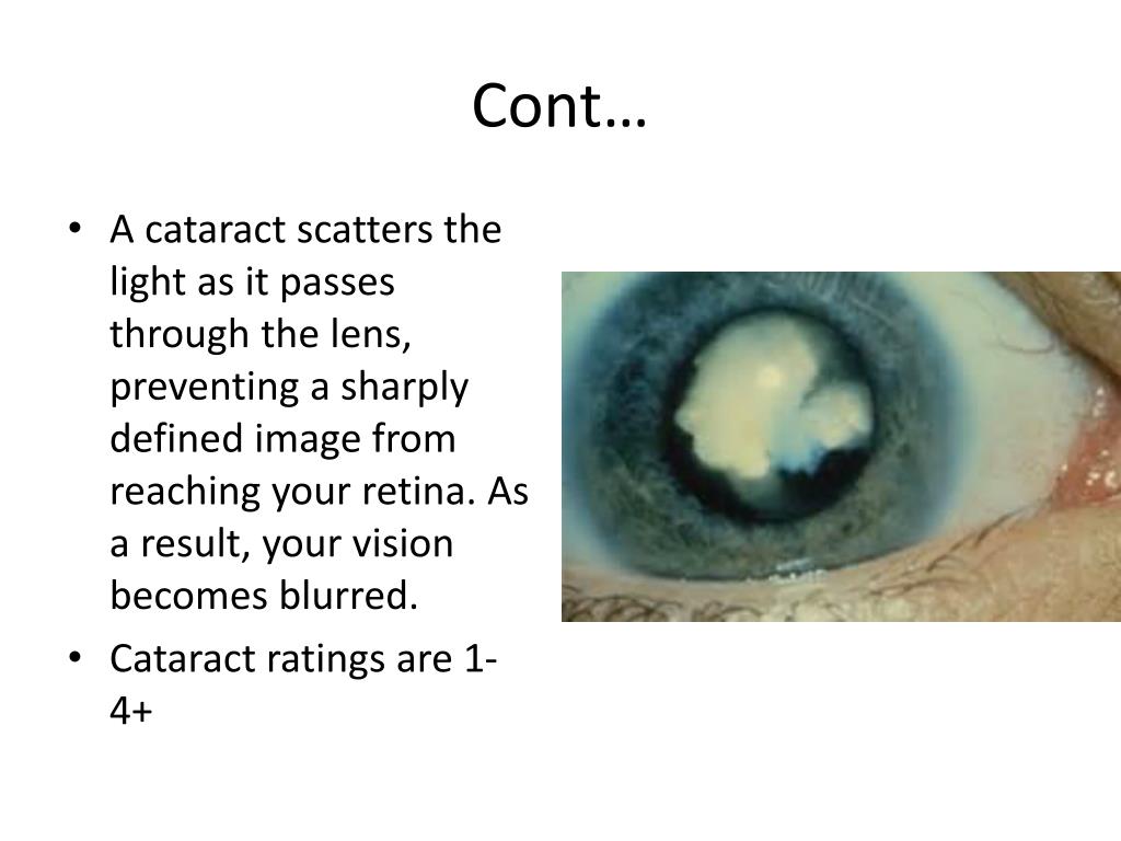 Cont… • A cataract scatters the light as it passes through the lens, preventing a sharply defined image from reaching your retina. As a result, your vision becomes blurred. • Cataract ratings are 1-4+