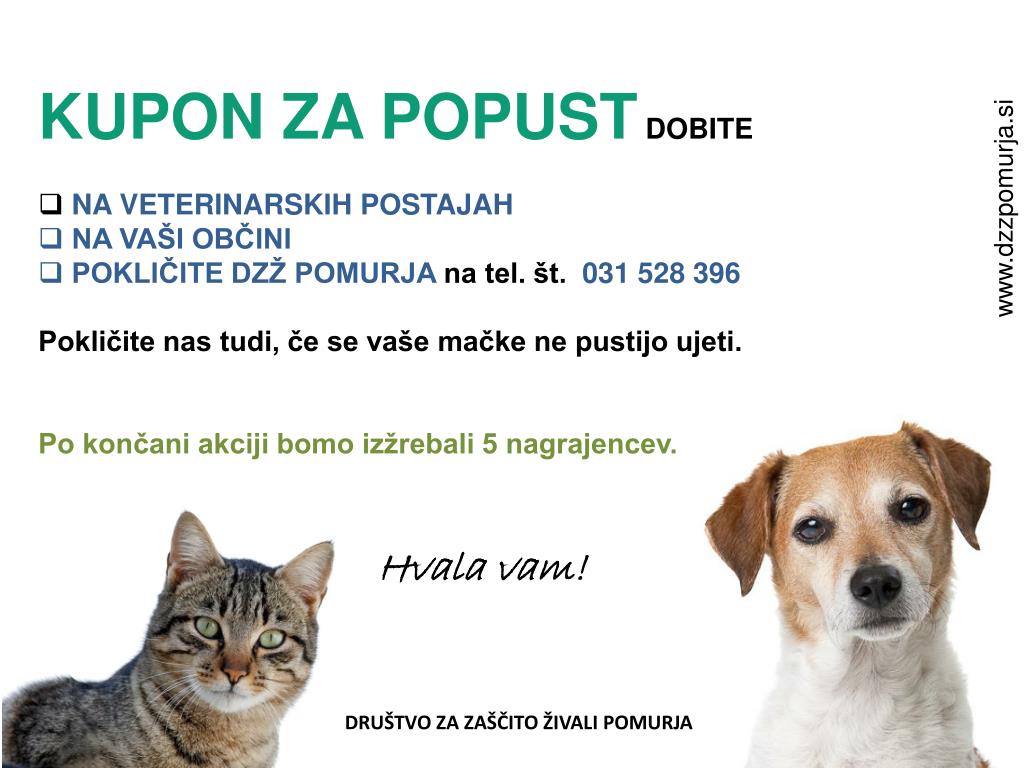 www.dzzpomurja.si KUPON ZA POPUST DOBITE • NA VETERINARSKIH POSTAJAH • NA VAŠI OBČINI • POKLIČITE DZŽ POMURJA na tel. št. 031 528 396 Pokličite nas tudi, če se vaše mačke ne pustijo ujeti. Po končani akciji bomo izžrebali 5 nagrajencev. Hvala vam! DRUŠTVO ZA ZAŠČITO ŽIVALI POMURJA