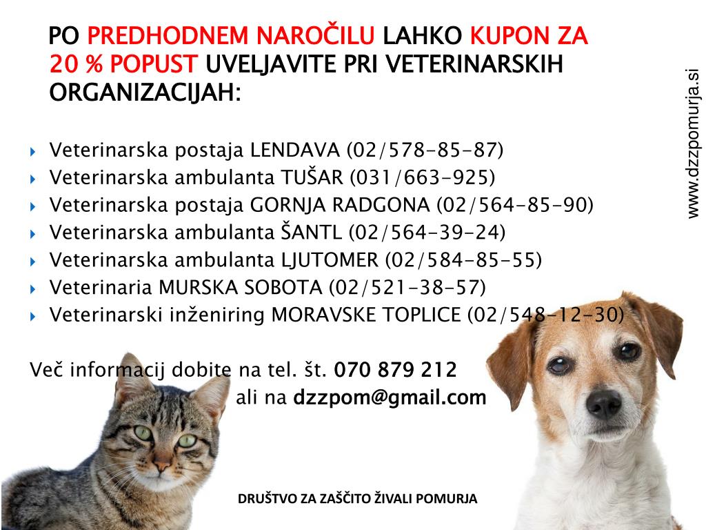www.dzzpomurja.si PO PREDHODNEM NAROČILU LAHKO KUPON ZA 20 % POPUST UVELJAVITE PRI VETERINARSKIH ORGANIZACIJAH: • Veterinarska postaja LENDAVA (02/578-85-87) • Veterinarska ambulanta TUŠAR (031/663-925) • Veterinarska postaja GORNJA RADGONA (02/564-85-90) • Veterinarska ambulanta ŠANTL (02/564-39-24) • Veterinarska ambulanta LJUTOMER (02/584-85-55) • Veterinaria MURSKA SOBOTA (02/521-38-57) • Veterinarski inženiring MORAVSKE TOPLICE (02/548-12-30) Več informacij dobite na tel. št. 070 879 212 ali na dzzpom@gmail.com DRUŠTVO ZA ZAŠČITO ŽIVALI POMURJA