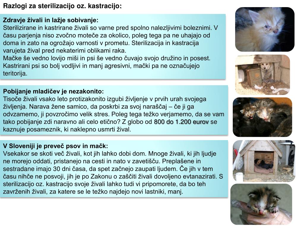 Razlogi za sterilizacijo oz. kastracijo׃ Zdravje živali in lažje sobivanje: Sterilizirane in kastrirane živali so varne pred spolno nalezljivimi boleznimi. V času parjenja niso zvočno moteče za okolico, poleg tega pa ne uhajajo od doma in zato na ogrožajo varnosti v prometu. Sterilizacija in kastracija varujeta žival pred nekaterimi oblikami raka. Mačke še vedno lovijo miši in psi še vedno čuvajo svojo družino in posest. Kastrirani psi so bolj vodljivi in manj agresivni, mački pa ne označujejo teritorija. Pobijanje mladičev je nezakonito: Tisoče živali vsako leto protizakonito izgubi življenje v prvih urah svojega življenja. Narava žene samico, da poskrbi za svoj naraščaj – če ji ga odvzamemo, ji povzročimo velik stres. Poleg tega težko verjamemo, da se vam tako pobijanje zdi naravno ali celo etično? Z globo od 800 do 1.200 eurov se kaznuje posameznik, ki naklepno usmrti žival. V Sloveniji je preveč psov in mačk: Vsekakor se skoti več živali, kot jih lahko dobi dom. Mnoge živali, ki jih ljudje ne morejo oddati, pristanejo na cesti in nato v zavetišču. Preplašene in sestradane imajo 30 dni časa, da spet začnejo zaupati ljudem. Če jih v tem času nihče ne posvoji, jih je po Zakonu o zaščiti živali dovoljeno evtanazirati. S sterilizacijo oz. kastracijo svoje živali lahko tudi vi pripomorete, da bo teh zavrženih živali, za katere se le težko najdejo novi lastniki, manj. 070 879 212 dzzpom@gmail.com