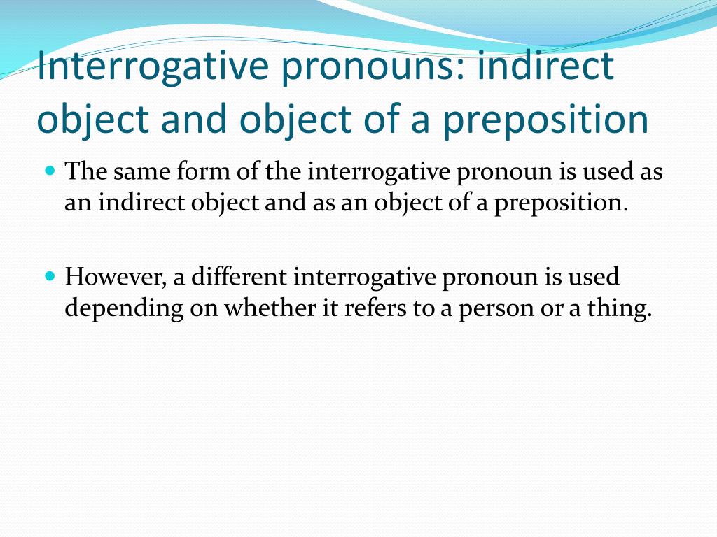 Interrogative pronouns: indirect object and object of a preposition • In English: It is difficult to identify an English interrogative pronoun functioning as an indirect object or as an object of a preposition because the interrogative pronoun is often separated from the preposition of which it is the object.