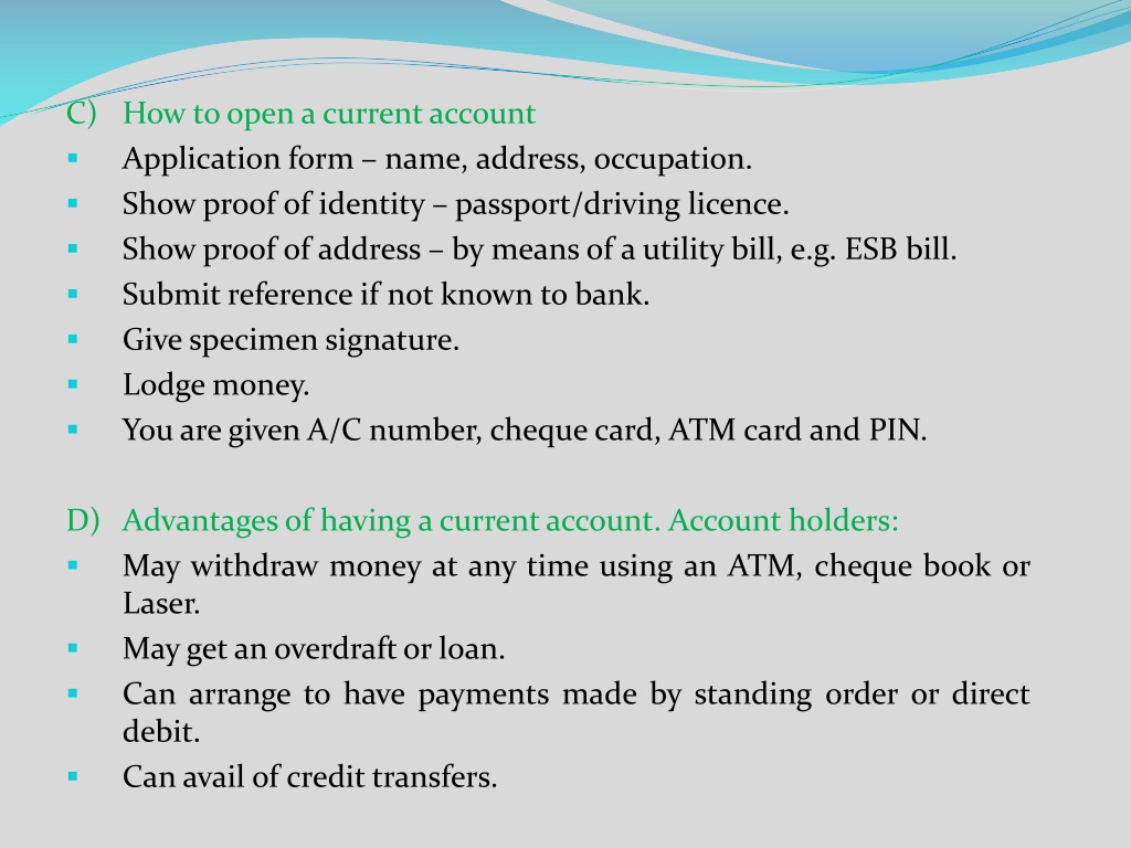 C) How to open a current account Application form – name, address, occupation. Show proof of identity – passport/driving licence. Show proof of address – by means of a utility bill, e.g. ESB bill. Submit reference if not known to bank. Give specimen signature. Lodge money. You are given A/C number, cheque card, ATM card and PIN. D) Advantages of having a current account. Account holders: May withdraw money at any time using an ATM, cheque book or Laser. May get an overdraft or loan. Can arrange to have payments made by standing order or direct debit. Can avail of credit transfers.