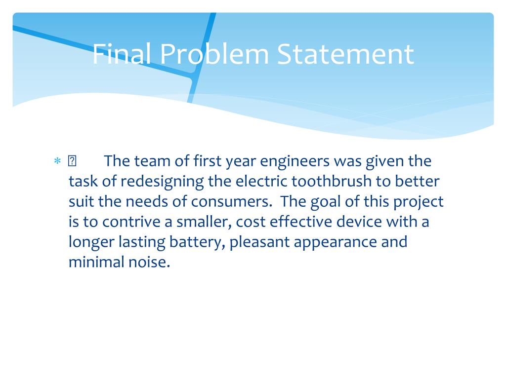 Final Problem Statement The team of first year engineers was given the task of redesigning the electric toothbrush to better suit the needs of consumers. The goal of this project is to contrive a smaller, cost effective device with a longer lasting battery, pleasant appearance and minimal noise.