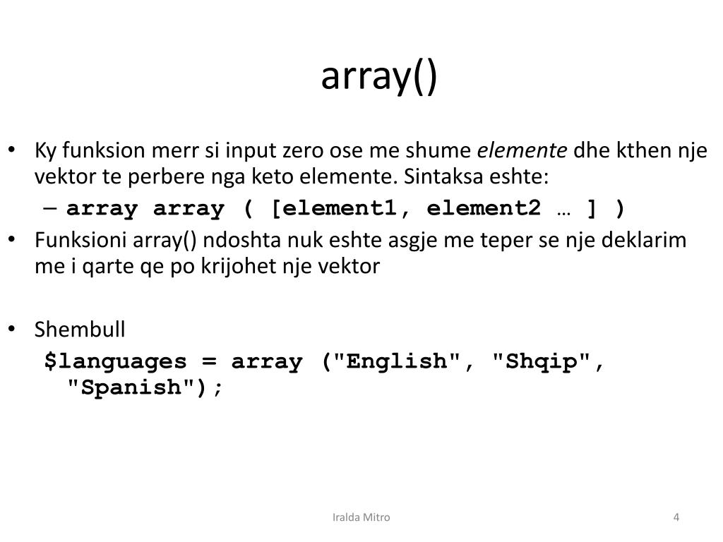 array() • Kyfunksionmerrsi input zero ose me shumeelementedhekthennjevektorteperberengaketoelemente. Sintaksaeshte: • array array ( [element1, element2 … ] ) • Funksioni array() ndoshtanukeshteasgje me teper se njedeklarim me iqarteqepokrijohetnjevektor • Shembull $languages = array ("English", "Shqip", "Spanish"); Iralda Mitro