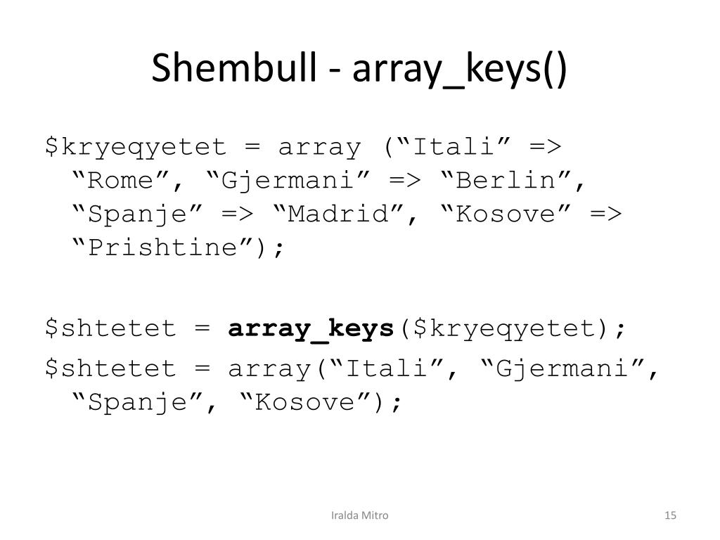 Shembull - array_keys() $kryeqyetet = array (“Itali” => “Rome”, “Gjermani” => “Berlin”, “Spanje” => “Madrid”, “Kosove” => “Prishtine”); $shtetet = array_keys($kryeqyetet); $shtetet = array(“Itali”, “Gjermani”, “Spanje”, “Kosove”); Iralda Mitro