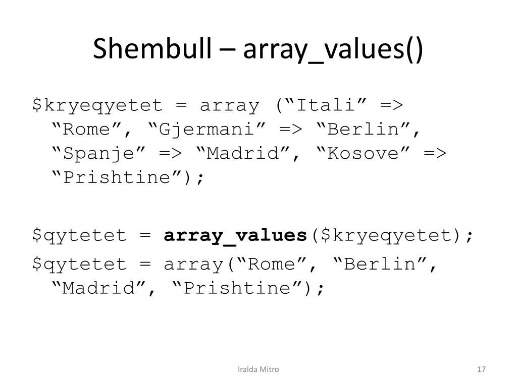 Shembull – array_values() $kryeqyetet = array (“Itali” => “Rome”, “Gjermani” => “Berlin”, “Spanje” => “Madrid”, “Kosove” => “Prishtine”); $qytetet = array_values($kryeqyetet); $qytetet = array(“Rome”, “Berlin”, “Madrid”, “Prishtine”); Iralda Mitro