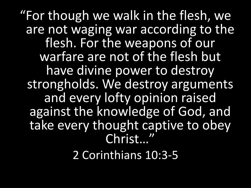 “For though we walk in the flesh, we are not waging war according to the flesh. For the weapons of our warfare are not of the flesh but have divine power to destroy strongholds. We destroy arguments and every lofty opinion raised against the knowledge of God, and take every thought captive to obey Christ…” 2 Corinthians 10:3-5