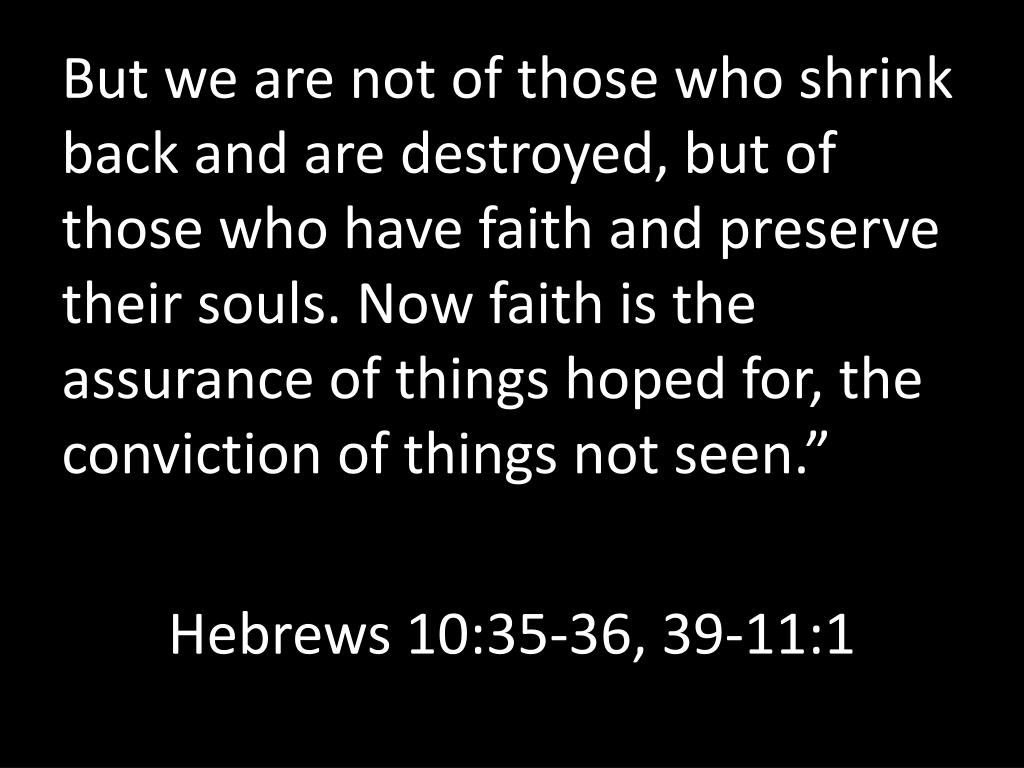 But we are not of those who shrink back and are destroyed, but of those who have faith and preserve their souls. Now faith is the assurance of things hoped for, the conviction of things not seen.” Hebrews 10:35-36, 39-11:1