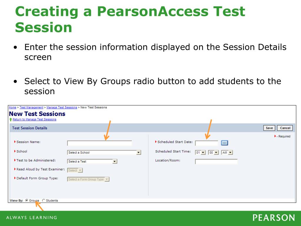 Creating a PearsonAccess Test Session Enter the session information displayed on the Session Details screen Select to View By Groups radio button to add students to the session
