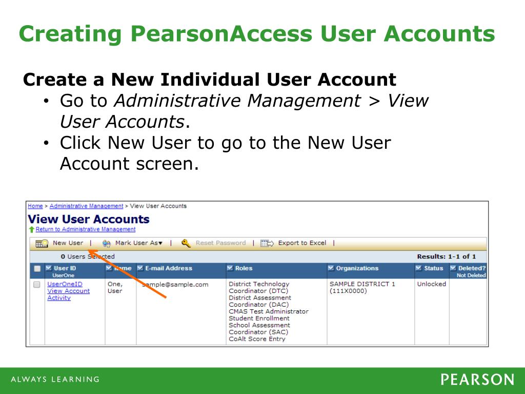 Creating PearsonAccess User Accounts • Create a New Individual User Account • Go to Administrative Management > View User Accounts. • Click New User to go to the New User Account screen.