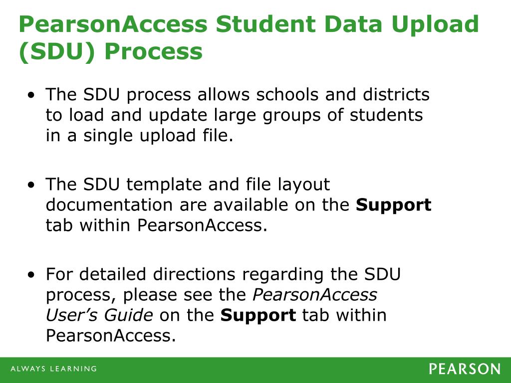 The SDU process allows schools and districts to load and update large groups of students in a single upload file. The SDU template and file layout documentation are available on the Support tab within PearsonAccess. For detailed directions regarding the SDU process, please see the PearsonAccess User’s Guide on the Support tab within PearsonAccess. PearsonAccess Student Data Upload (SDU) Process