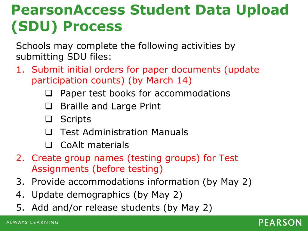 Schools may complete the following activities by submitting SDU files: Submit initial orders for paper documents (update participation counts) (by March 14) Paper test books for accommodations Braille and Large Print Scripts Test Administration Manuals CoAlt materials Create group names (testing groups) for Test Assignments (before testing) Provide accommodations information (by May 2) Update demographics (by May 2) Add and/or release students (by May 2) PearsonAccess Student Data Upload (SDU) Process