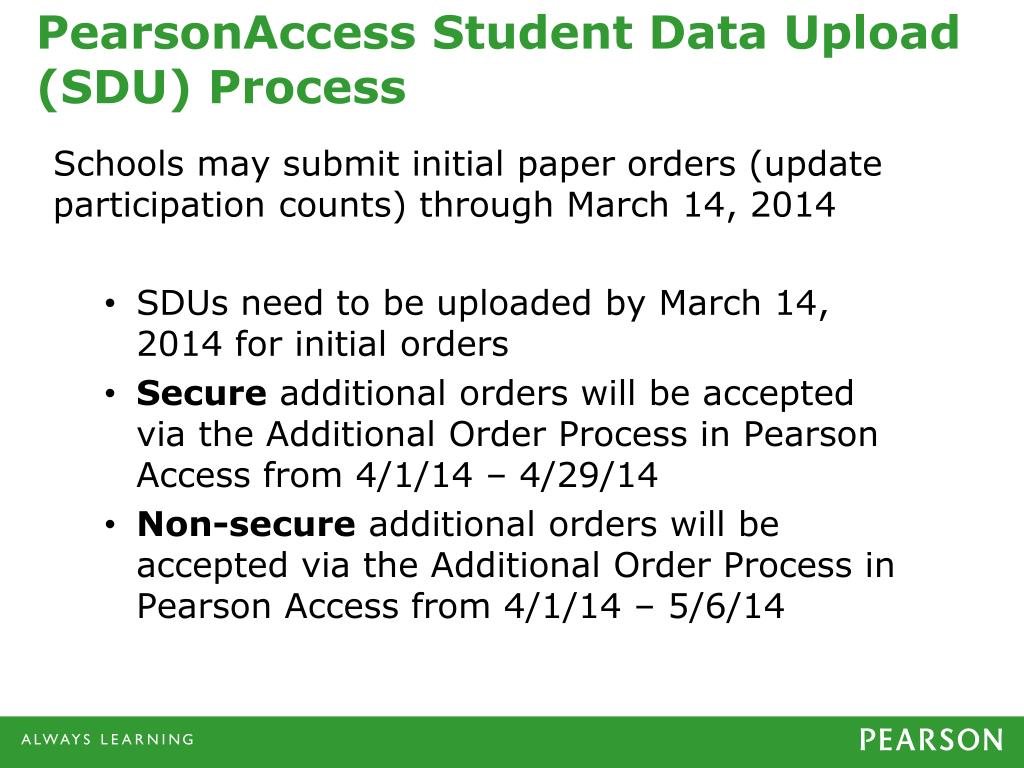 Schools may submit initial paper orders (update participation counts) through March 14, 2014 SDUs need to be uploaded by March 14, 2014 for initial orders Secure additional orders will be accepted via the Additional Order Process in Pearson Access from 4/1/14 – 4/29/14 Non-secure additional orders will be accepted via the Additional Order Process in Pearson Access from 4/1/14 – 5/6/14 PearsonAccess Student Data Upload (SDU) Process