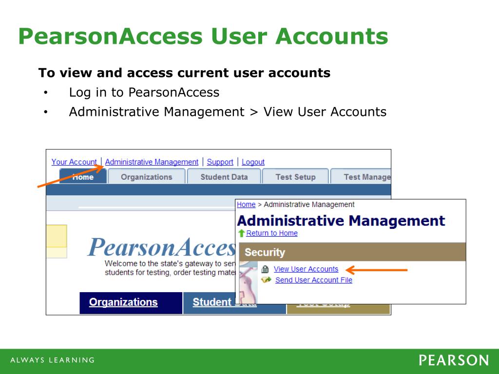 PearsonAccess User Accounts • To view and access current user accounts • Log in to PearsonAccess • Administrative Management > View User Accounts