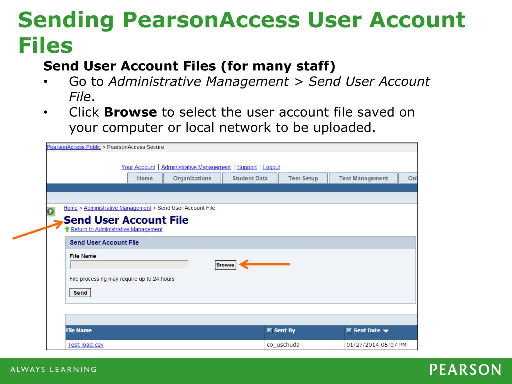 Sending PearsonAccess User Account Files • Send User Account Files (for many staff) • Go to Administrative Management > Send User Account File. • Click Browse to select the user account file saved on your computer or local network to be uploaded.