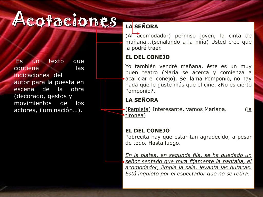 Acotaciones LA SEÑORA (Al acomodador) permiso joven, la cinta de mañana...(señalando a la niña) Usted cree que la podré traer. EL DEL CONEJO Yo también vendré mañana, éste es un muy buen teatro (María se acerca y comienza a acariciar el conejo). Se llama Pomponio, no hay nada que le guste más que el cine. ¿No es cierto Pomponio?. LA SEÑORA (Perpleja) Interesante, vamos Mariana. (la tironea) EL DEL CONEJO Pobrecita hay que estar tan agradecido, a pesar de todo. Hasta luego. En la platea, en segunda fila, se ha quedado un señor sentado que mira fijamente la pantalla, el acomodador, limpia la sala, levanta las butacas. Está inquieto por el espectador que no se retira. Es un texto que contiene las indicaciones del autor para la puesta en escena de la obra (decorado, gestos y movimientos de los actores, iluminación…).