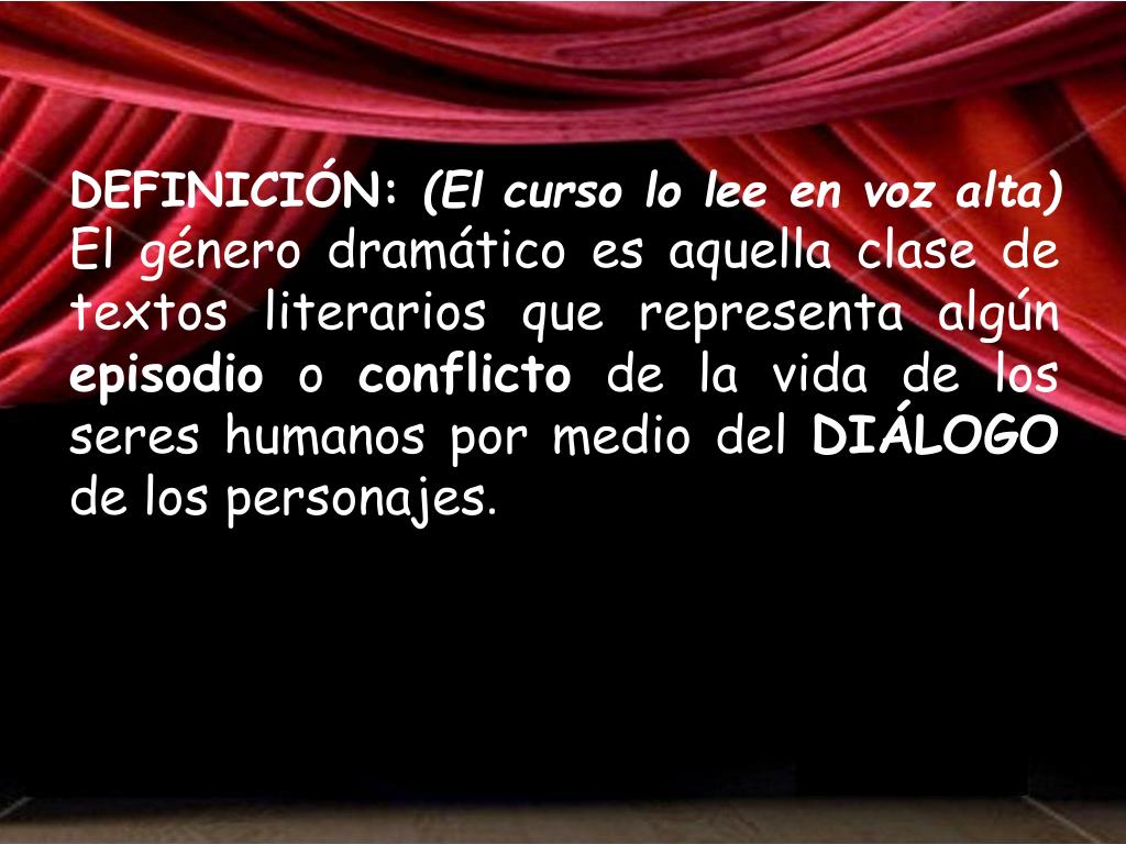 DEFINICIÓN: (El curso lo lee en voz alta) El género dramático es aquella clase de textos literarios que representa algún episodio o conflicto de la vida de los seres humanos por medio del DIÁLOGO de los personajes.