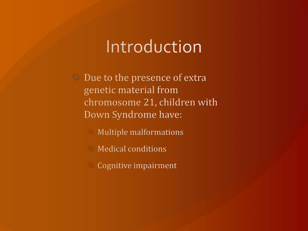 Introduction • Due to the presence of extra genetic material from chromosome 21, children with Down Syndrome have: • Multiple malformations • Medical conditions • Cognitive impairment