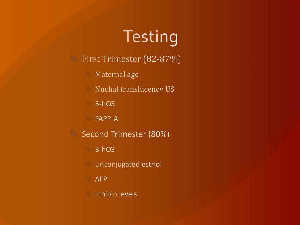 Testing • First Trimester (82-87%) • Maternal age • Nuchal translucency US • Β-hCG • PAPP-A • Second Trimester (80%) • Β-hCG • Unconjugatedestriol • AFP • Inhibin levels
