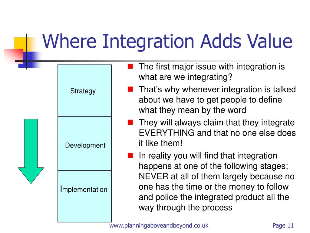 Strategy Development Implementation Where Integration Adds Value • The first major issue with integration is what are we integrating? • That’s why whenever integration is talked about we have to get people to define what they mean by the word • They will always claim that they integrate EVERYTHING and that no one else does it like them! • In reality you will find that integration happens at one of the following stages; NEVER at all of them largely because no one has the time or the money to follow and police the integrated product all the way through the process www.planningaboveandbeyond.co.uk