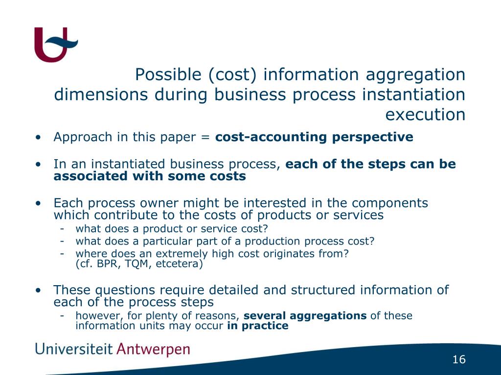 Possible (cost) information aggregation dimensions during business process instantiation execution • Approach in this paper = cost-accounting perspective • In an instantiated business process, each of the steps can be associated with some costs • Each process owner might be interested in the components which contribute to the costs of products or services • what does a product or service cost? • what does a particular part of a production process cost? • where does an extremely high cost originates from?(cf. BPR, TQM, etcetera) • These questions require detailed and structured information of each of the process steps • however, for plenty of reasons, several aggregations of these information units may occur in practice