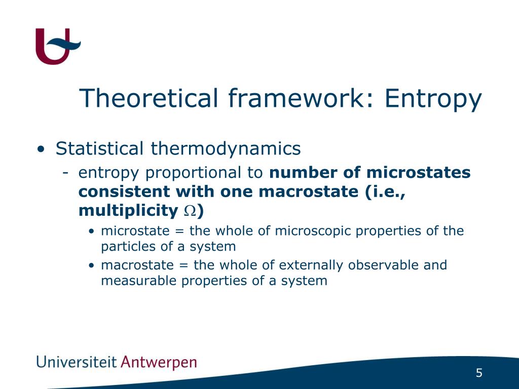 Theoretical framework: Entropy • Statistical thermodynamics • entropy proportional to number of microstates consistent with one macrostate (i.e., multiplicity ) • microstate = the whole of microscopic properties of the particles of a system • macrostate = the whole of externally observable and measurable properties of a system