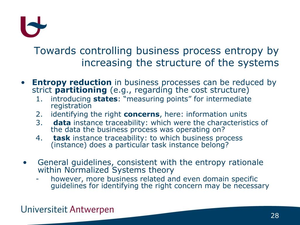Towards controlling business process entropy by increasing the structure of the systems • Entropy reduction in business processes can be reduced by strict partitioning (e.g., regarding the cost structure) • introducing states: “measuring points” for intermediate registration • identifying the right concerns, here: information units • data instance traceability: which were the characteristics of the data the business process was operating on? • task instance traceability: to which business process (instance) does a particular task instance belong? • General guidelines, consistent with the entropy rationale within Normalized Systems theory • however, more business related and even domain specific guidelines for identifying the right concern may be necessary