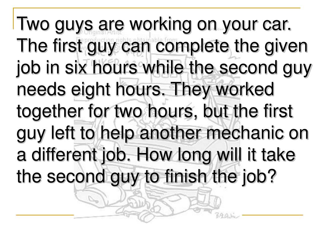 Two guys are working on your car. The first guy can complete the given job in six hours while the second guy needs eight hours. They worked together for two hours, but the first guy left to help another mechanic on a different job. How long will it take the second guy to finish the job?