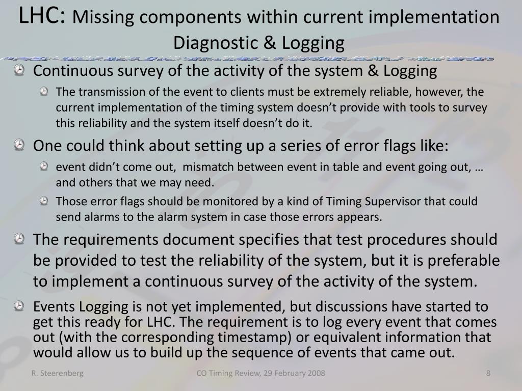 LHC: Missing components within current implementationDiagnostic & Logging • Continuous survey of the activity of the system & Logging • The transmission of the event to clients must be extremely reliable, however, the current implementation of the timing system doesn’t provide with tools to survey this reliability and the system itself doesn’t do it. • One could think about setting up a series of error flags like: • event didn’t come out, mismatch between event in table and event going out, … and others that we may need. • Those error flags should be monitored by a kind of Timing Supervisor that could send alarms to the alarm system in case those errors appears. • The requirements document specifies that test procedures should be provided to test the reliability of the system, but it is preferable to implement a continuous survey of the activity of the system. • Events Logging is not yet implemented, but discussions have started to get this ready for LHC. The requirement is to log every event that comes out (with the corresponding timestamp) or equivalent information that would allow us to build up the sequence of events that came out. CO Timing Review, 29 February 2008