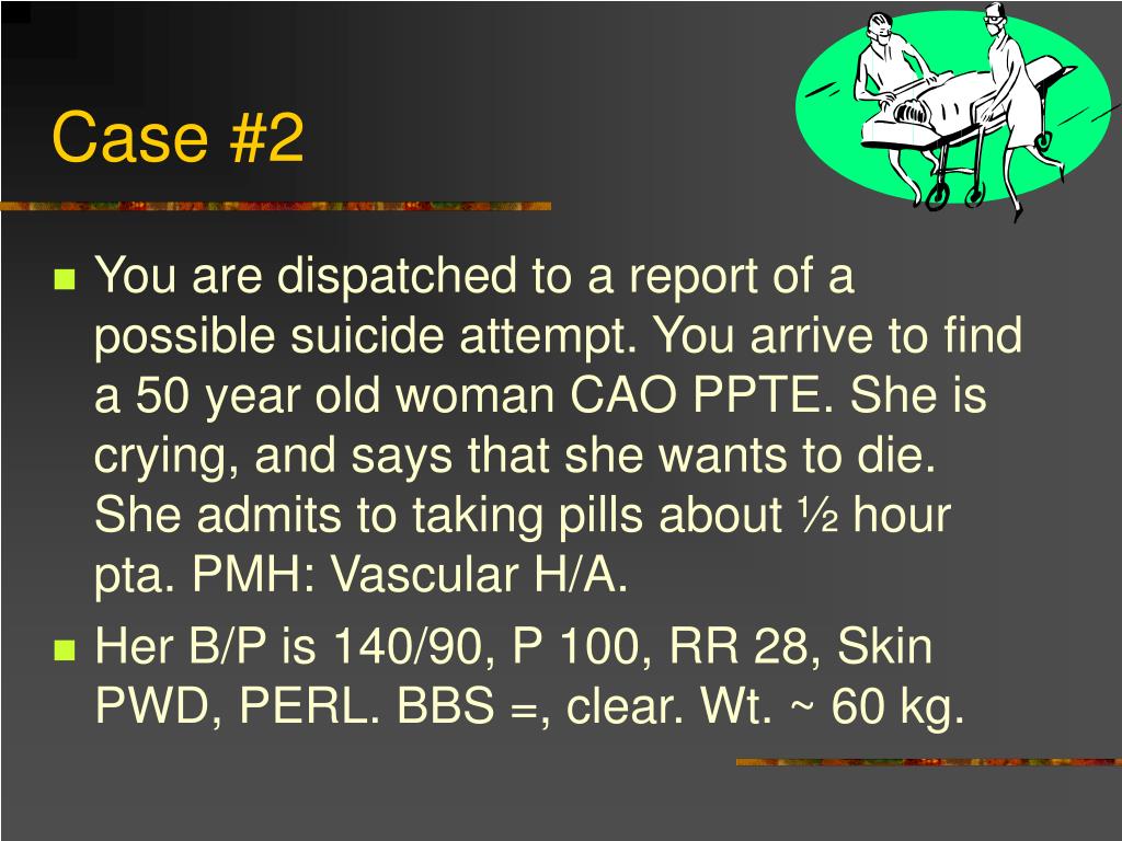 Case #2 • You are dispatched to a report of a possible suicide attempt. You arrive to find a 50 year old woman CAO PPTE. She is crying, and says that she wants to die. She admits to taking pills about ½ hour pta. PMH: Vascular H/A. • Her B/P is 140/90, P 100, RR 28, Skin PWD, PERL. BBS =, clear. Wt. ~ 60 kg.