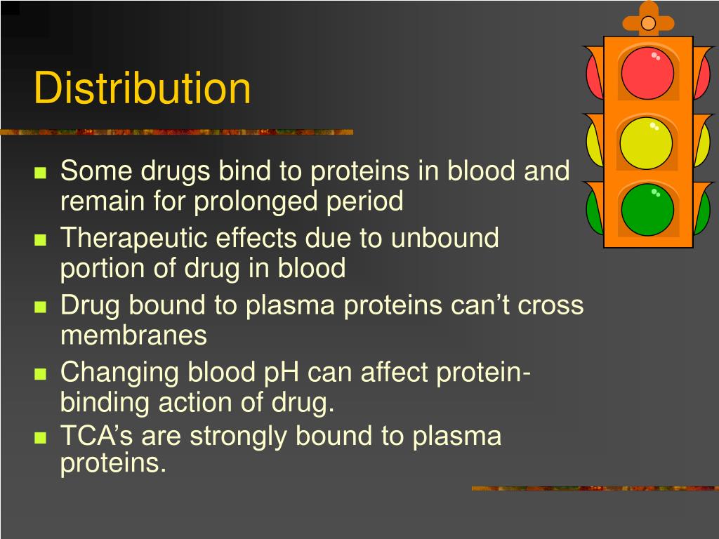 Distribution • Some drugs bind to proteins in blood and remain for prolonged period • Therapeutic effects due to unbound portion of drug in blood • Drug bound to plasma proteins can’t cross membranes • Changing blood pH can affect protein-binding action of drug. • TCA’s are strongly bound to plasma proteins.