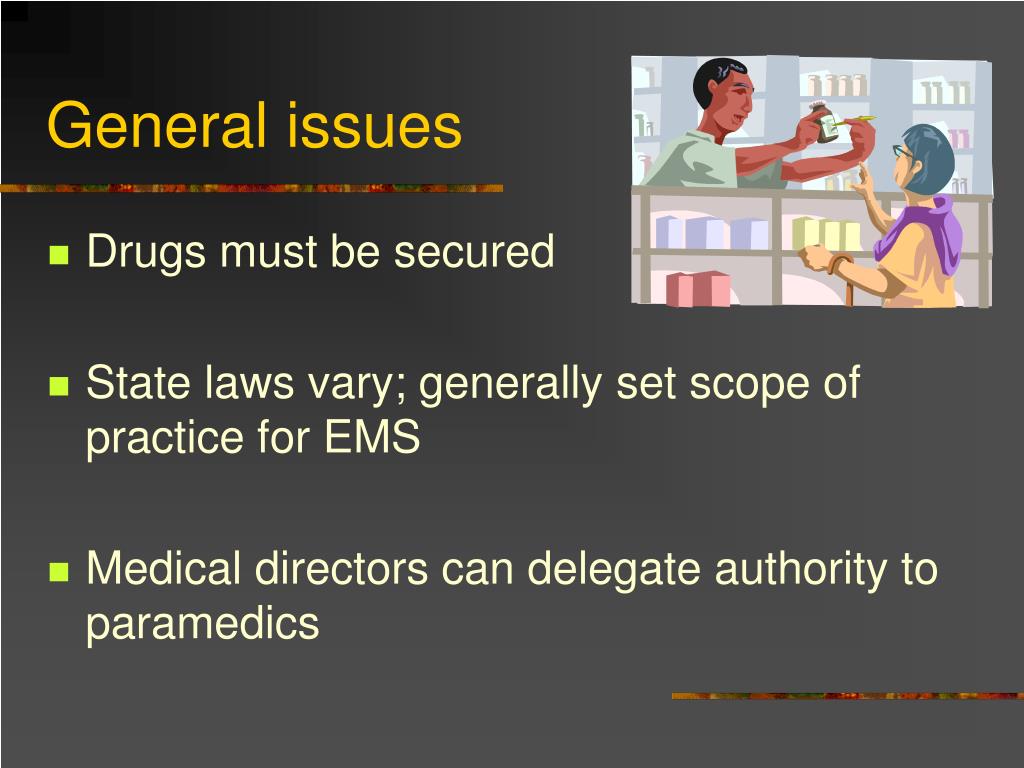 General issues • Drugs must be secured • State laws vary; generally set scope of practice for EMS • Medical directors can delegate authority to paramedics