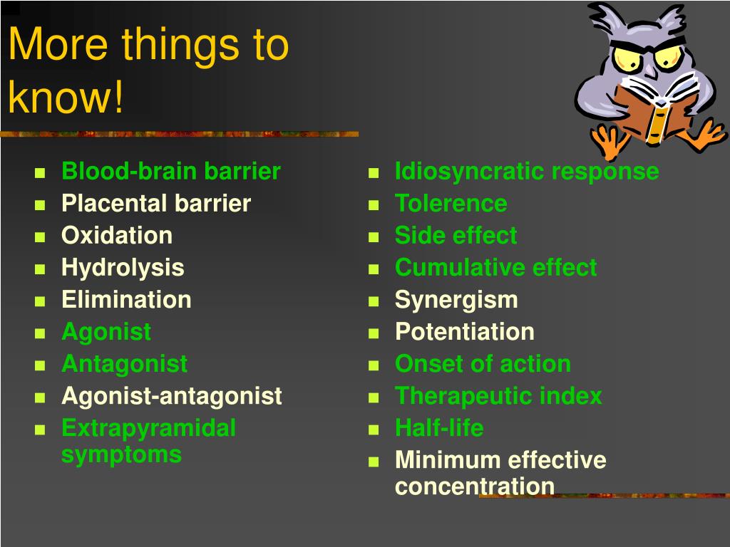 Blood-brain barrier Placental barrier Oxidation Hydrolysis Elimination Agonist Antagonist Agonist-antagonist Extrapyramidal symptoms Idiosyncratic response Tolerence Side effect Cumulative effect Synergism Potentiation Onset of action Therapeutic index Half-life Minimum effective concentration More things to know!