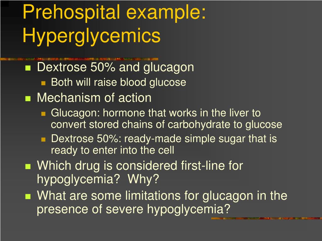 Prehospital example: Hyperglycemics • Dextrose 50% and glucagon • Both will raise blood glucose • Mechanism of action • Glucagon: hormone that works in the liver to convert stored chains of carbohydrate to glucose • Dextrose 50%: ready-made simple sugar that is ready to enter into the cell • Which drug is considered first-line for hypoglycemia? Why? • What are some limitations for glucagon in the presence of severe hypoglycemia?